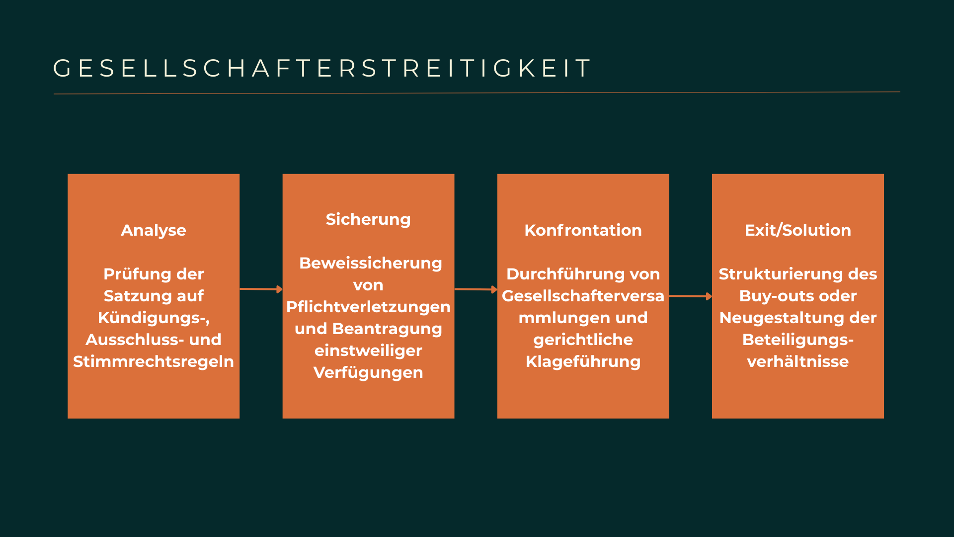 Interne Streitigkeiten zwischen Gesellschaftern binden wertvolle Ressourcen und können ein Unternehmen bis zum Stillstand lähmen. SOLVE bietet Ihnen die juristische Durchsetzungskraft, um Blockaden zu lösen, ob durch die Geltendmachung von Ansprüchen im Wege der Actio pro socio oder die Abwehr destruktiver Minderheitsgesellschafter. Wir agieren als Ihr taktischer Berater, um Ihre Beteiligungswerte zu schützen und die operative Freiheit der Gesellschaft auch in Phasen schwerer Zerwürfnisse sicherzustellen.