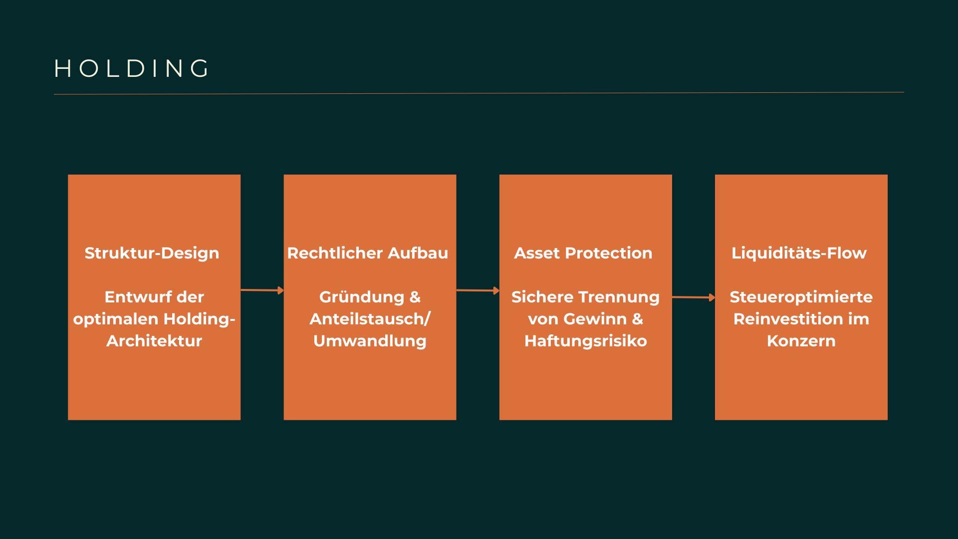 Die Kanzlei SOLVE begleitet Unternehmer dabei, aus einer Einzelfirma oder einer simplen GmbH einen schlagkräftigen Unternehmensverbund zu formen. Wir analysieren Ihre aktuelle Situation und zeigen Ihnen auf, wie Sie durch eine Holding-Struktur von der 95%-igen Steuerbefreiung auf Dividenden und Veräußerungsgewinne profitieren können. Im Rahmen des SOLVE-Pakets übernehmen wir die gesamte rechtliche Umsetzung – von der Satzungsgestaltung bis hin zum komplexen Anteilstausch unter Berücksichtigung des Umwandlungssteuerrechts. Wir legen einen besonderen Fokus auf die Asset Protection: Gewinne werden aus der haftungsanfälligen operativen Ebene in die sichere Holding-Ebene überführt, bevor Risiken entstehen können.