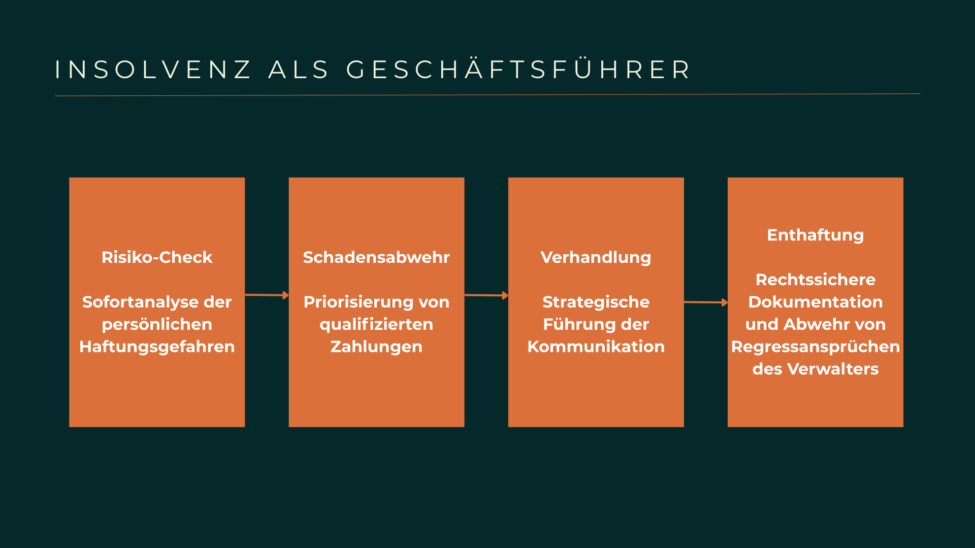 Abschließend begleiten wir Sie durch alle Phasen der persönlichen Enthaftung, um Ihre finanzielle Freiheit und berufliche Reputation für die Zeit nach der Unternehmenskrise zu bewahren.