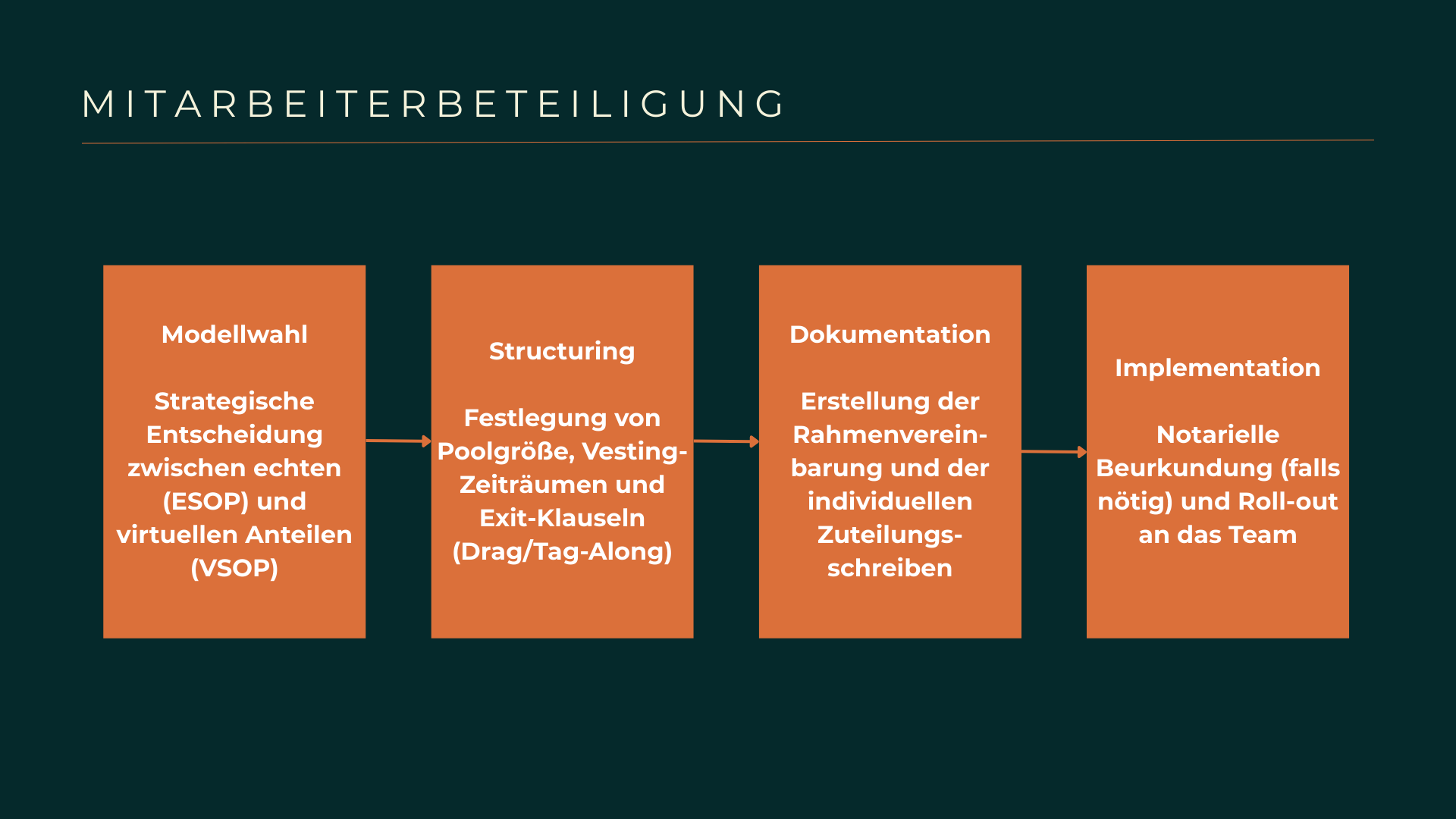 Parallel dazu gestalten wir die notwendigen Gesellschafterbeschlüsse zur Schaffung eines Beteiligungspools und begleiten die notarielle Umsetzung, falls eine direkte Beteiligung am Stammkapital angestrebt wird. Wir beraten Ihre Personalabteilung bei der Kommunikation der Programme, damit die komplexen rechtlichen und wirtschaftlichen Vorteile für Ihre Mitarbeiter verständlich und motivierend transportiert werden. Unsere Experten prüfen die Vereinbarkeit der Programme mit bestehenden Investorenverträgen und stellen sicher, dass Ihre Cap-Table für künftige Finanzierungsrunden attraktiv und übersichtlich bleibt. Wir integrieren steueroptimierte Strukturen nach § 19a EStG, um die aufgeschobene Besteuerung der Anteile für Ihre Mitarbeiter rechtssicher nutzbar zu machen.