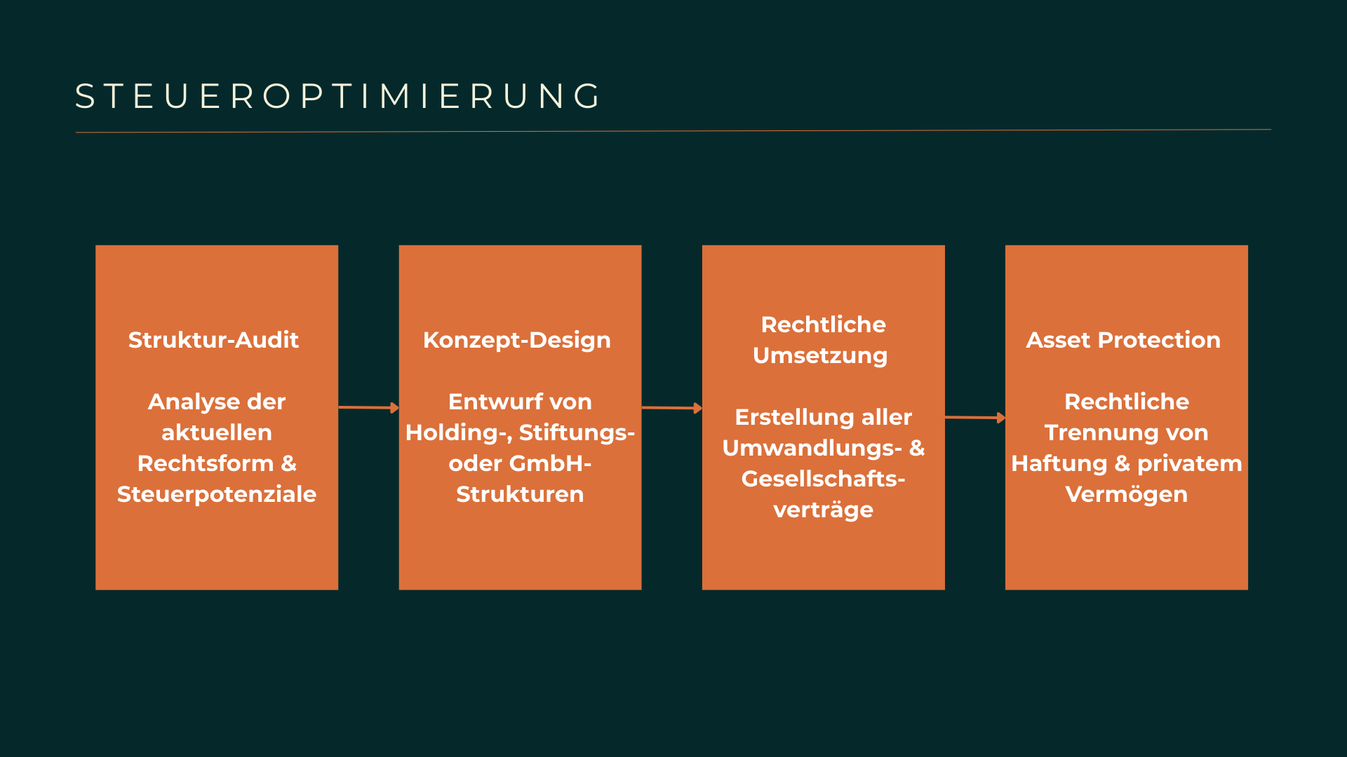 Echte Steueroptimierung beginnt nicht bei der Buchhaltung, sondern bei der Wahl der richtigen rechtlichen Architektur Ihres Unternehmens. Als spezialisierte Rechtsanwälte entwickeln wir für Sie hocheffiziente Konzepte wie Holding-Strukturen oder Stiftungsmodelle, um Ihre Steuerlast legal und nachhaltig zu senken. Mit SOLVE transformieren wir Ihr Unternehmen in ein rechtliches Setup, das Ihr Vermögen schützt und Ihnen maximale finanzielle Flexibilität für Reinvestitionen verschafft.